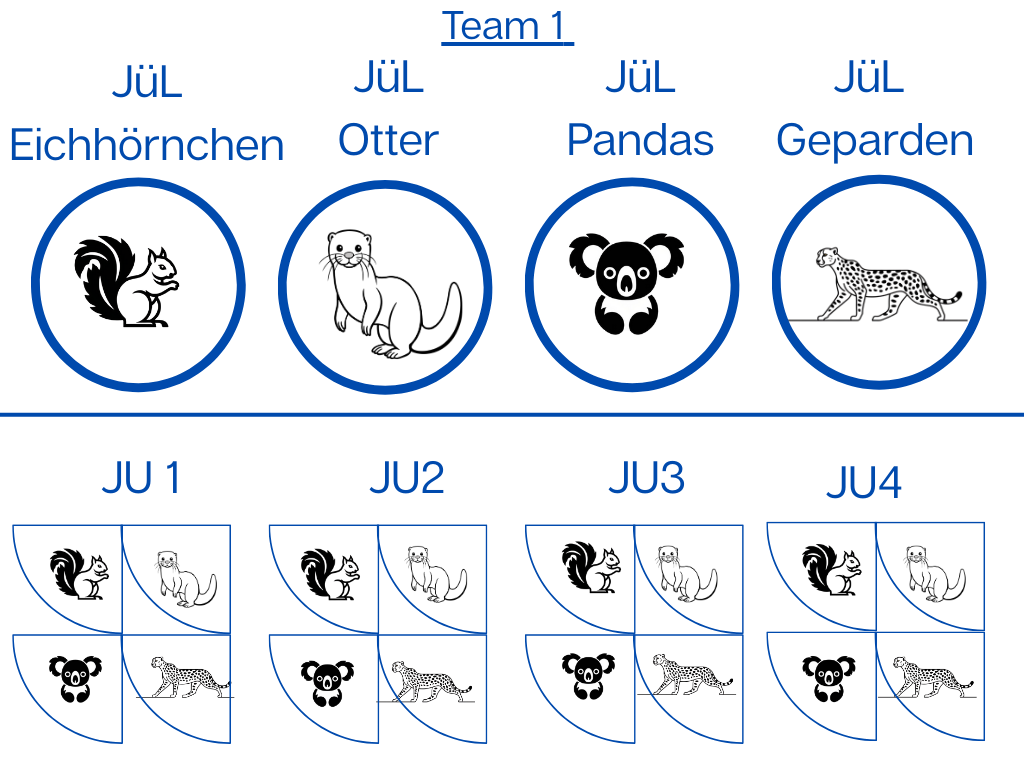 Es gibt zwölf jahrgangsübergreifende Klassen (JüL) mit jeweils 24-27 Kindern der Jahrgangsstufen 1-4 gemischt an der Dietrich-Bonhoeffer-Schule. Sie sind zu drei Teams zusammen gefasst. Die Kinder eines Teams haben gemeinsamen jahrgangsbezogenen Unterricht (JU).